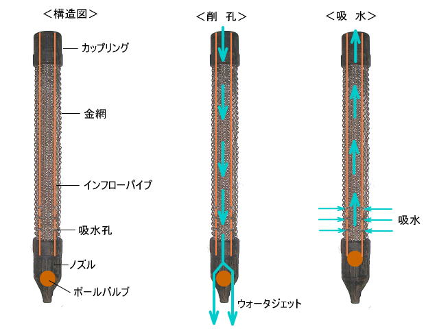 削孔が終わるとボールバルブ(木製)の浮上によってインプローパイプ先端が閉塞され、ジェット孔からの土砂流入が防止されます。